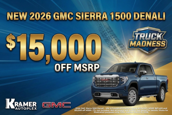 2026 GMC Sierra 1500 Denali - VIN 1GTUUHEL9TZ114747 | Stock #G114747 | MSRP $87,405 and $15,000 off MSRP. TTL not included. Not all buyers will qualify. See dealer for details. Photo for illustration purposes only. Offer expires March 31, 2026.