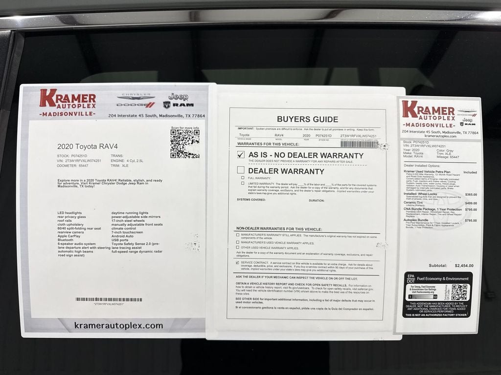 Bluetooth® technology is built into this 2020 Toyota RAV4 , keeping your hands on the steering wheel and your focus on the road. See what's behind you with the back up camera on this 2020 Toyota RAV4 . It's Cross-Traffic Alert: Safeguarding you from unexpected traffic when reversing. It offers Automatic Climate Control for personalized comfort. This Toyota RAV4's blind spot monitor enhances safety. Our dealership has already run the CARFAX report and it is clean. A clean CARFAX is a great asset for resale value in the future. The Toyota RAV4 offers Apple CarPlay for seamless connectivity. This unit comes equipped with Android Auto for seamless smartphone integration on the road. Set the temperature exactly where you are most comfortable in this 2020 Toyota RAV4 . The fan speed and temperature will automatically adjust to maintain your preferred zone climate. Front wheel drive on this vehicle gives you better traction and better fuel economy.