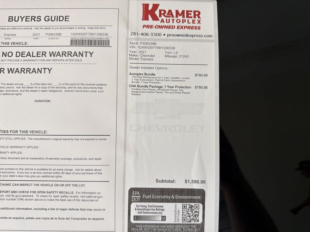 2021 Chevrolet Express 2500 LS - low mileage, ready to work in Livingston, TX. This rugged full-size van features a powerful V8 6.6L gasoline engine and rear-wheel drive for towing confidence and dependable performance. With just 21,245 miles, this Chevrolet Express offers exceptional value for businesses or families needing cargo space and reliability. Comfort and convenience features include Hands Free Bluetooth® for safer calling and media streaming, a Back-Up Camera and Rear Parking Sensors to simplify maneuvering and loading, plus Lane Departure Warning to help maintain road awareness on long drives. The interior is designed for practicality with durable surfaces and configurable seating or cargo area to suit trades, delivery, shuttle, or conversion projects. Safety and history are documented with a CARFAX Clean Report, giving you added assurance about the vehicle's background. The van's low mileage means many miles of service remain, and its straightforward mechanical design makes maintenance and repairs easy for most shops. Located in Livingston, TX, this 2021 Chevrolet Express 2500 LS combines proven Chevrolet durability with useful modern tech and safety aids. Contact us to schedule a test drive or to get more details and vehicle history - this low-mileage Chevrolet Express is ready to work.