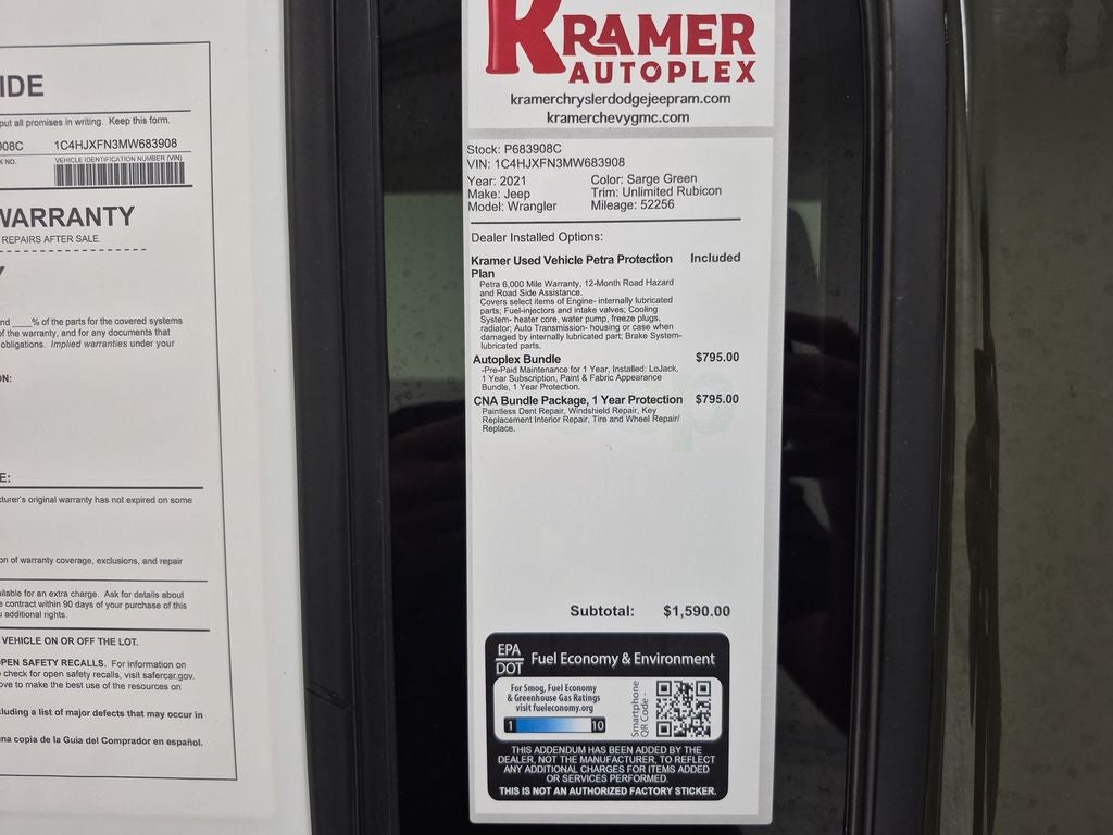 See what's behind you with the back up camera on it. Apple CarPlay: Seamless smartphone integration for this unit - stay connected and entertained on the go! An off-road package is equipped on this vehicle. The installed navigation system will keep you on the right path. with XM/Sirus Satellite Radio you are no longer restricted by poor quality local radio stations while driving the vehicle. Anywhere on the planet, you will have hundreds of digital stations to choose from. Our dealership has already run the CARFAX report and it is clean. A clean CARFAX is a great asset for resale value in the future. This unit features a hands-free Bluetooth® phone system. This 2021 Jeep Wrangler offers Automatic Climate Control for personalized comfort. Good News! This certified CARFAX 1-owner vehicle has only had one owner before you. It offers Android Auto for seamless smartphone integration. This model has a 4 Cyl, 2.0L high output engine.