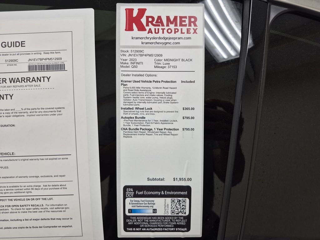 See what's behind you with the back up camera on this vehicle. This vehicle is pure luxury with a heated steering wheel. This mid-size car's Forward Collision Warning feature alerts drivers to potential front-end collisions. This 2023 INFINITI Q50 's Lane Departure Warning keeps you safe by alerting you when you drift from your lane. The leather seats in this 2023 INFINITI Q50 are a must for buyers looking for comfort, durability, and style. This model offers Automatic Climate Control for personalized comfort. Engulf yourself with the crystal clear sound of a BOSE sound system in this mid-size car. The rear parking assist technology on this 2023 INFINITI Q50 will put you at ease when reversing. The system alerts you as you get closer to an obstruction. Never get into a cold vehicle again with the remote start feature on this mid-size car. This vehicle offers Android Auto for seamless smartphone integration.