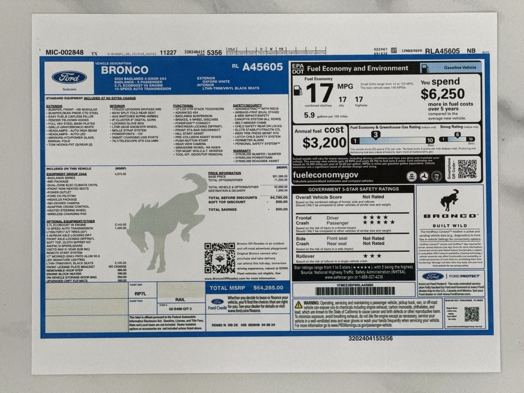Equipment Group 334A High/lux Package: Rear Parking Sensors; Power Outlet - Back Side of Center Floor Console; Auto-Dimming Interior Rearview Mirror; Driver and Front Passenger Illuminated Sliding Visor Vanity Mirrors; Evasive Steering Assist; Heated Steering Wheel; Additional Sound Deadening; Information on Demand Panel; Wireless Charging Pad; Dual-Zone Electronic Automatic Temperature Control; Ambient Footwell Lighting; Remote Start System; 2-Door Intelligent Access with Lock/unlock; 17" Machined Carbonized Aluminum Wheels; Dual Smart Charging USB Ports; Front Row Heated Seats; Adaptive Cruise Control; B&O Sound System by Bang and Olufsen; Front Parking Sensors; 360-Degree Camera; LT285/70R17 A/T Tires; Universal Garage Door Opener; Sideview Mirrors. Ford Co-Pilot360: Auto High-Beam Headlamps; Rear View Camera; Pre-Collision Assist with Automatic Emergency Braking; Blind Spot Information System (BLIS); Lane-Keeping System. Leather-Trimmed/vinyl Bucket Seats. Removable Hoop Step. Door Storage Bags. Upgraded Carpet Floor Mats. **Equipment listed is based on original vehicle build and subject to change. Please confirm the accuracy of the included equipment by calling the dealer prior to purchase.**