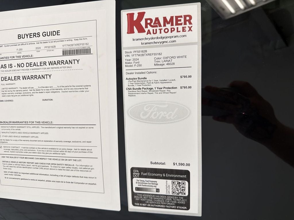 The installed navigation system will keep you on the right path. This 2024 Ford F-250 Super Duty is equipped with the latest generation of XM/Sirius Radio. See what's behind you with the back up camera on this Ford F-250. Start this model from inside with remote start. This 3/4 ton pickup has a clean CARFAX vehicle history report. Bluetooth® technology is built into this Ford F-250, keeping your hands on the steering wheel and your focus on the road. The leather seats in this 3/4 ton pickup are a must for buyers looking for comfort, durability, and style. Keep your hands warm all winter with a heated steering wheel in this 3/4 ton pickup . This vehicle is a certified CARFAX 1-owner. Set the temperature exactly where you are most comfortable in this unit. The fan speed and temperature will automatically adjust to maintain your preferred zone climate. The Ford F-250 has four wheel drive capabilities.
