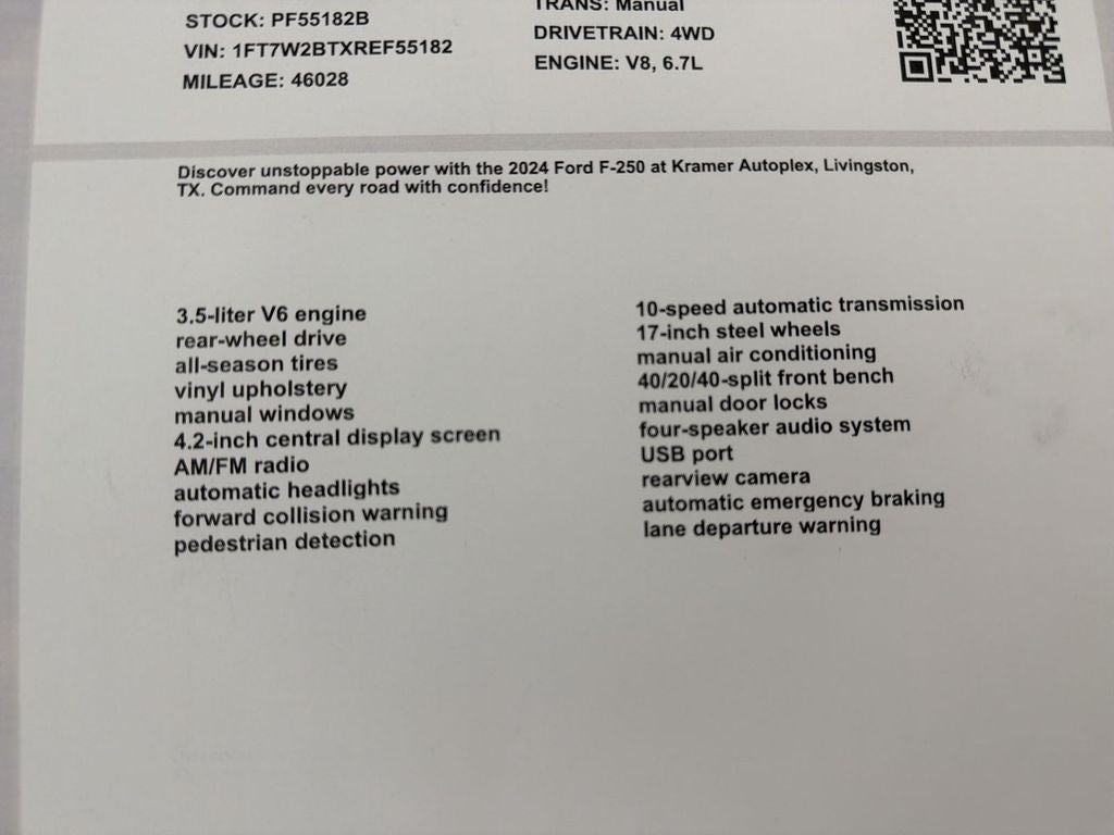 2024 Ford F-250 Super Duty LARIAT — powerful performance, premium comfort, and rugged dependability all in one impressive package. This 4WD heavy-duty pickup arrives with a robust V8 6.7L Diesel engine and 46,028 miles, delivering the torque and towing capacity you need for demanding jobs or weekend adventures. Located in Livingston, TX, this Ford F-250 combines serious capability with upscale features that elevate every drive. Step inside to find leather seats and a heated steering wheel that surround you in comfort during long hauls or chilly mornings. The available Navigation system keeps you confidently on course, while the Back-Up Camera enhances safety and maneuverability in tight spots. This truck also carries a CARFAX 1-Owner history, offering extra reassurance about its maintenance and ownership background. The LARIAT trim balances luxury and utility—premium interior touches meet heavy-duty hardware, so you get a refined cockpit alongside rugged performance. Whether you're towing equipment, hauling supplies, or cruising across Texas highways, this Ford F-250 is engineered to perform. Priced to sell and positioned as the best price for comparable models in the area, this 2024 Ford F-250 Super Duty LARIAT represents exceptional value for buyers seeking a diesel-powered, low-mileage truck with top-tier features. Visit Livingston, TX to test drive this powerhouse and experience why it's the smart choice for capability and comfort.