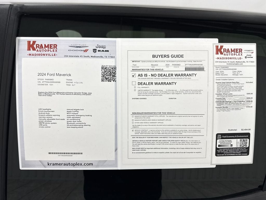 Ready for adventure and city life, this 2024 Ford Maverick XLT in Madisonville, TX combines compact versatility with confident AWD capability. With just 1,031 miles, this Ford Maverick offers low mileage and a like-new driving experience. Powered by a responsive 4-cylinder 2.0L gasoline engine, it delivers capable performance for daily commuting and weekend escapes. Well-equipped for convenience and safety, this Ford Maverick includes Hands-Free Bluetooth® for seamless smartphone connectivity, a Back-Up Camera to assist with parking and maneuvering, and Automatic Climate Control to keep the cabin comfortable in any weather. The vehicle comes with a CARFAX Clean Report and is a CARFAX 1-Owner model, reflecting careful ownership and a documented history you can trust. Inside, the thoughtfully designed cabin offers durable materials and modern tech, while the XLT trim provides practical upgrades that enhance comfort and utility. The compact footprint and available AWD make it a versatile choice for varying road conditions around Madisonville and beyond. If you want a nearly new Ford Maverick XLT with low mileage, verified history, practical features, and confident AWD capability, this one is worth a closer look. Contact us to schedule a test drive and experience the blend of practicality and modern convenience this Ford Maverick delivers.