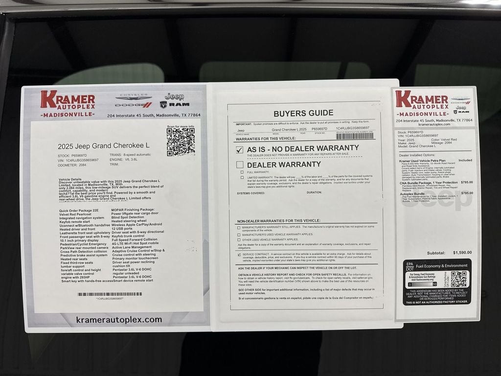 The vehicle features a hands-free Bluetooth® phone system. Start this vehicle from inside with remote start. The leather seats in this vehicle are a must for buyers looking for comfort, durability, and style. This Jeep Grand Cherokee L's Forward Collision Warning feature alerts drivers to potential front-end collisions. This 2025 Jeep Grand Cherokee L has automated speed control that adjusts to maintain a safe following distance, enhancing highway driving convenience. Apple CarPlay: Seamless smartphone integration for this Jeep Grand Cherokee L - stay connected and entertained on the go! This mid-size suv comes equipped with Android Auto for seamless smartphone integration on the road. Protect the Jeep Grand Cherokee L from unwanted accidents with a cutting edge backup camera system. Keep your hands warm all winter with a heated steering wheel in this 2025 Jeep Grand Cherokee L . This vehicle is a certified CARFAX 1-owner. The installed navigation system will keep you on the right path.